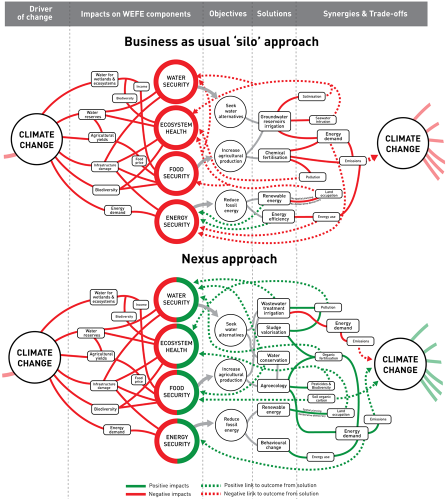 The Mediterranean region represents a climate change hotspot, characterised by the interaction of multiple intense climate hazards and by high levels of exposure and vulnerability. Rising temperatures, more frequent and intense droughts, and increasing pressure on natural resources threaten access to water, agricultural production, energy systems, and ecosystem health. Faced with the limitation of sector-specific responses, the authors chose to examine these challenges through the water-energy-food-ecosystems (WEFE) nexus. This integrated perspective helps identify the cascading impacts of climate change and avoid maladaptation. Their analysis shows that placing water at the center of action can strengthen cross-sectoral synergies and enhance regional resilience.