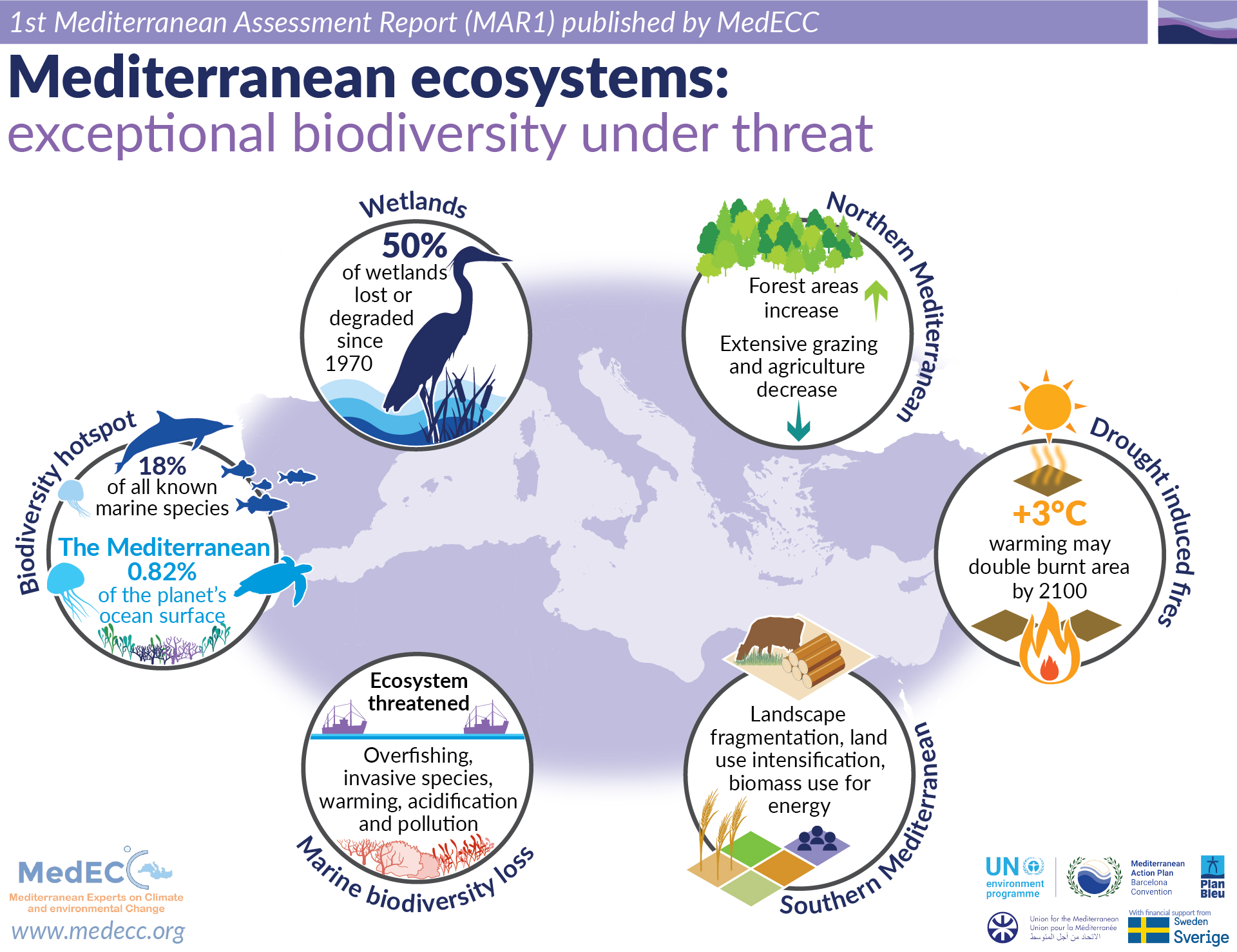 This infographic is based on the Chapter 4 “Ecosystems” of the First Mediterranean Assessment Report that was published in 2020. It illustrates the impacts of environmental and climate change on terrestrial and marine mediterranean ecosystems.